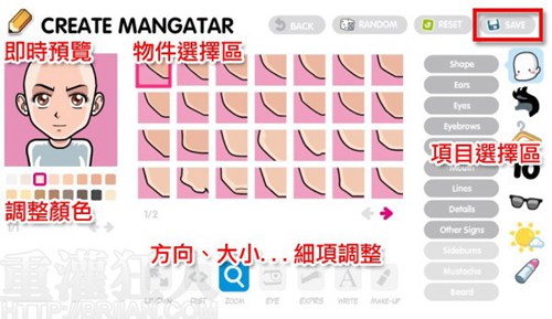第2步接下来,就是依照自己的需求,去选择、组合各种项目、物件,完成大头贴后,按下右上方的「SAVE」。