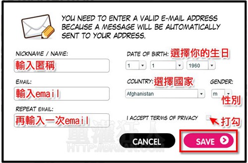 第3步再来会要求输入一些资料,然后就会将你制作的图示下载连结mail到你的信箱中。(若真的不想输入,咳!也可以利用键盘上的PrtSc 键把画面抓下来就好了。嘘~不要跟别人说)