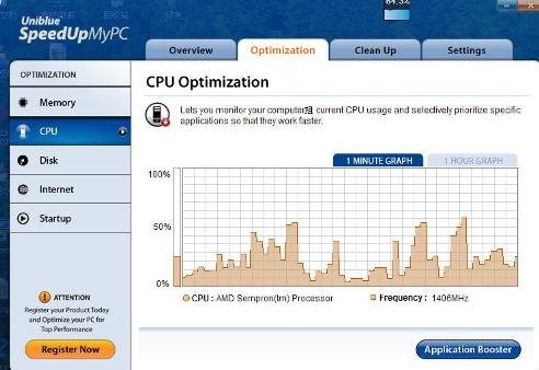 Uniblue SpeedUpMyPC 提供了一些与众不同的状态图表。用户可以查看实时的CPU、内存和Internet占用率的时间图表(以分钟或小时为单位)。这个工具软件还允许用户测试连接速度,并优化Internet设置。它有一个方便的启动程序优化器,用户用它可以轻松地清除那些当Windows启动时自动运行的、需要吃掉大量内存的应用程序。它的系统崩溃恢复向导能够终止那些没有响应的应用程序。与Memory Optimizer一样,用户可以为正在运行的应用程序分配更高的CPU占用优先权。